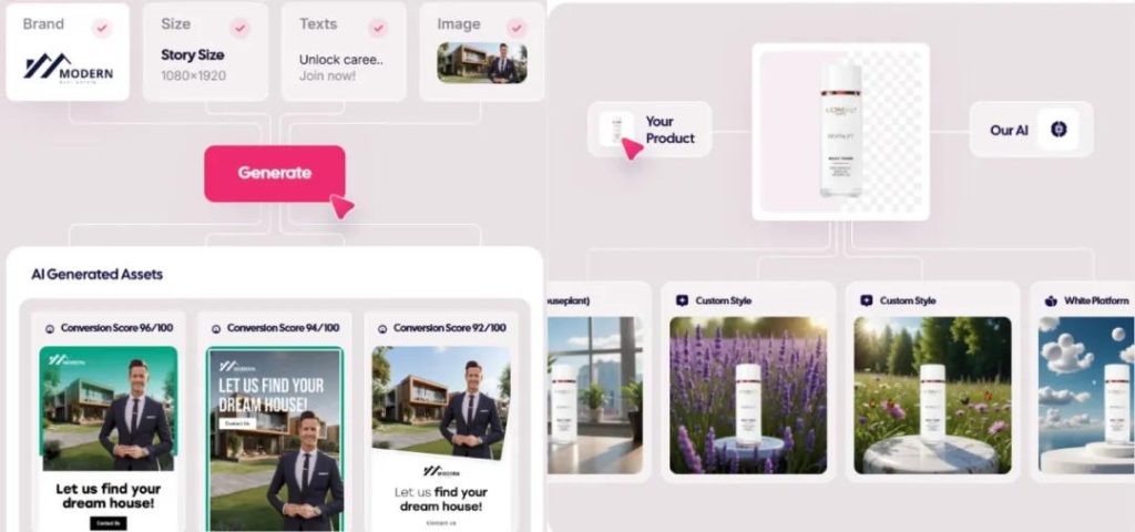 AI tools like AdCreative.ai and PhotoRoom offer intuitive platforms with thousands of templates. Brands input product images, key selling points, and target demographics—say, “young women, skincare enthusiasts”—and the AI generates hundreds of tailored ad visuals in 10–30 minutes. This “minutes-to-market” approach fits perfectly for e-commerce product pages or social media campaigns.