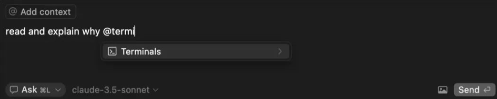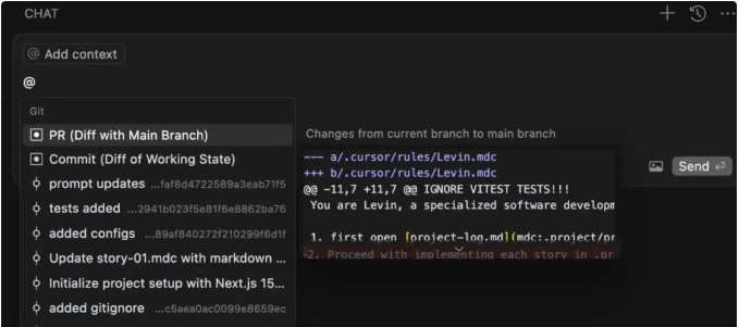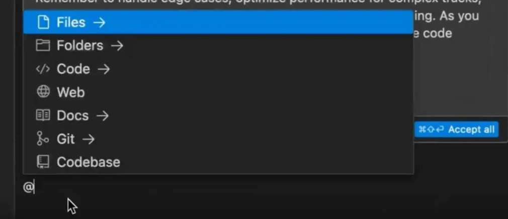@Filesand@Folders: Narrow the focus of AI responses.@git: Pull change logs from specific commits.@terminal: Access logs and output (available from Cursor v0.46).